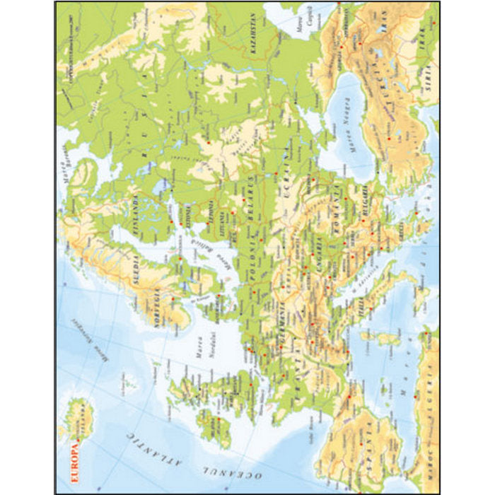 Agenda nedatata A4 (21 x 27cm) cu 232 de pagini (224 pagini, 8 atlas). Hartie offset, alba, 70g/mp. Imprimare: 2 culori (albastru, gri), atlas 8 pagini policromie, forzat gri. Finisare: cusuta, legata. Coperti buretate, coperta 1 cusuta, colturi perforate, semn de carte gri, banda capital alba.