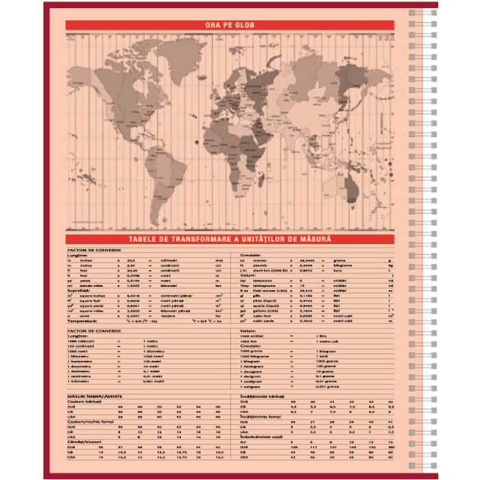 Agenda nedatata A4 (20.5x26cm) cu 208 de pagini (colita planning - 16 pagini). Hartie offset, alba, 70g/mp. Harti si informatii tiparite pe forzatul asortat cromatic cu coperta. Imprimare: 1 culoare, gri. Finisare: spira metalica argintie. Colturi perforate. Personalizare coperta: folio sau timbru sec. Personalizare interior: 2-4 pagini hartie cremata mata alba 130 g/mp.