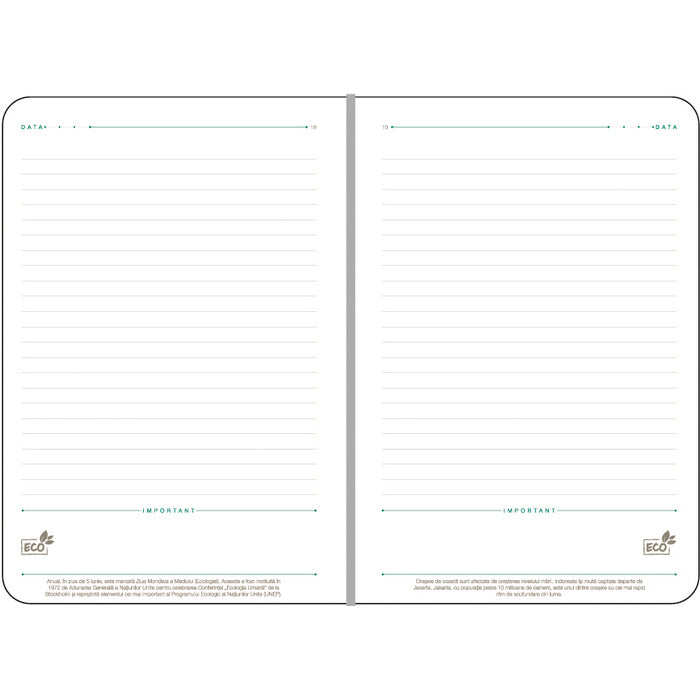 Agenda nedatata A5 (16x23.5cm) cu 192 de pagini. Hartie offset reciclata, 80g/mp. Imprimare: 2 culori (verde, gri). Finisare: cusuta, legata. Colturi rotunjite. Finisare speciala asigurand o deschidere de 180 de grade. Cant tiparit la culoarea copertei.