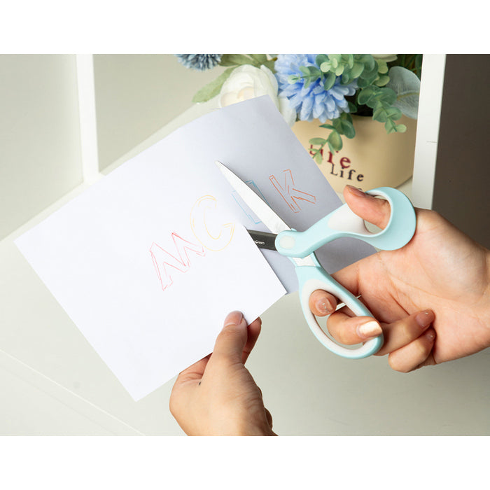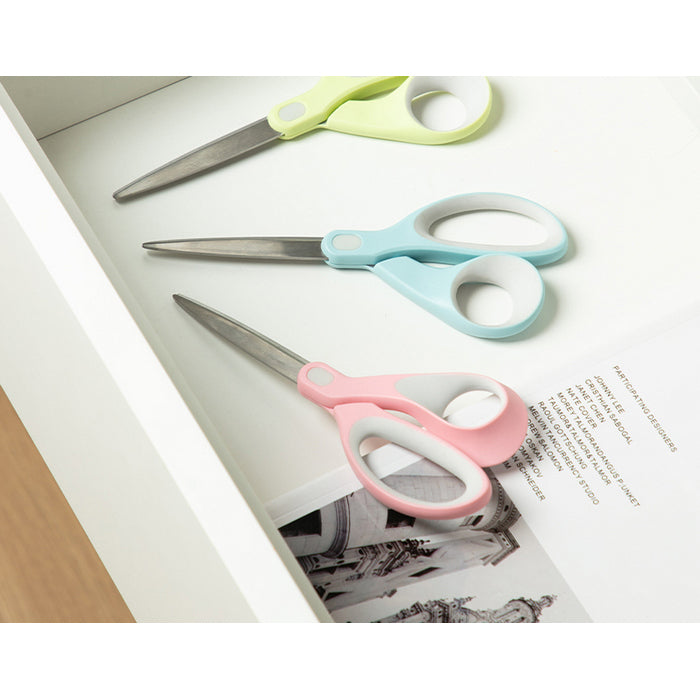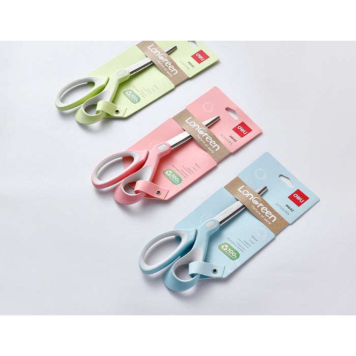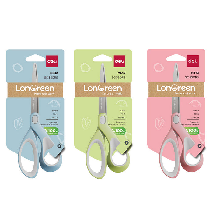 cu manere asimetrice si grip cauciucat. Lame rezistente din otel inoxidabil. Varf usor rotunjit. Forma ergonomica pentru o utilizare confortabila. Disponibila in 3 culori pastel. Dimensiuni: 18 x 7.5 x 1.2 cm.