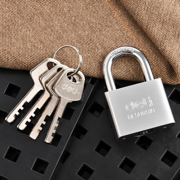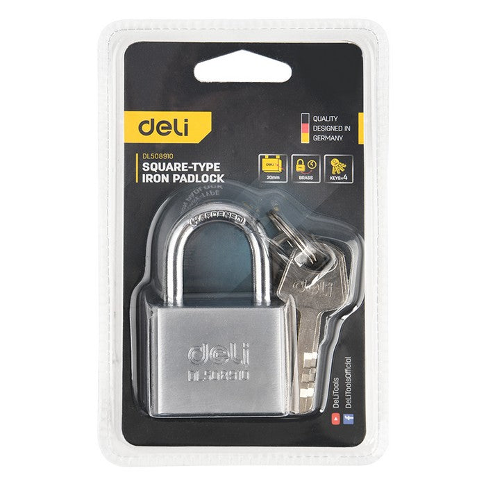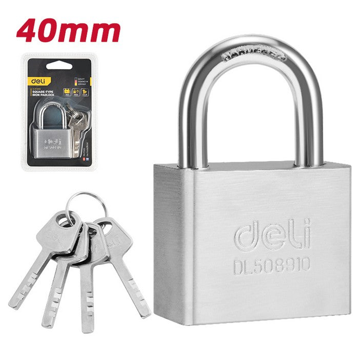 Lacat patrat Deli, realizat din fier cu miez solid din cupru, rezistent la coroziune. Lacatul se vinde impreuna cu 4 chei. Latime corp lacat de 40 mm, ideala pentru porți, dulapuri, dulapuri și cutii de scule.