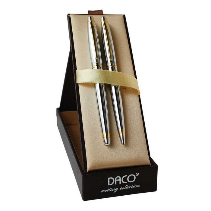 corp metalic argintiu cu ornamente aurii, stilou cu patron de cerneală, peniţă iridium; pix cu mină tip Cross
