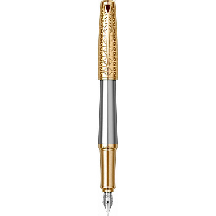 corp din aluminiu polisat anodizat cu lac grafit, accesorii din alama placate cu aur de 23K prin tehnologie PVD (Physical Vapor Deposition Systems). Clip din otel inoxidabil placat cu aur de 23K prin tehnologie PVD. Capac din alama, placat cu aur de 23K. Capacul se inchide prin apasare. Grip din aluminiu sablat anodizat cu aur de 23K prin tehnologie PVDPenita din otel inoxidabil polisat, avand in varf pastila de iridiu. Stiloul functioneaza atat cu cartuse, cat si cu convertor.