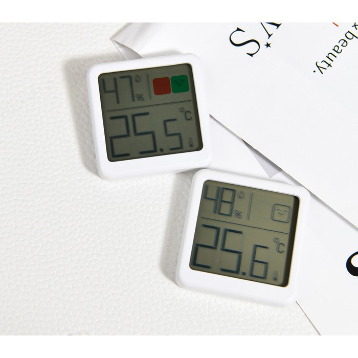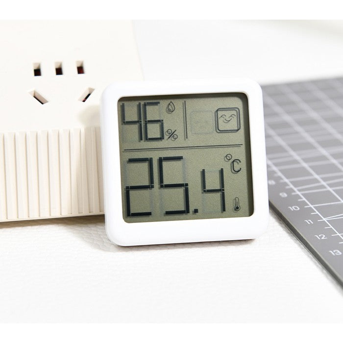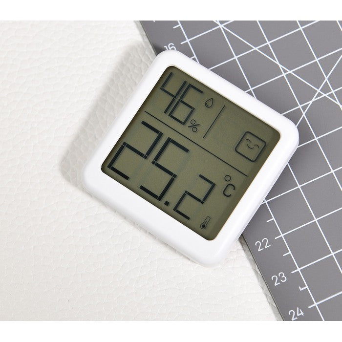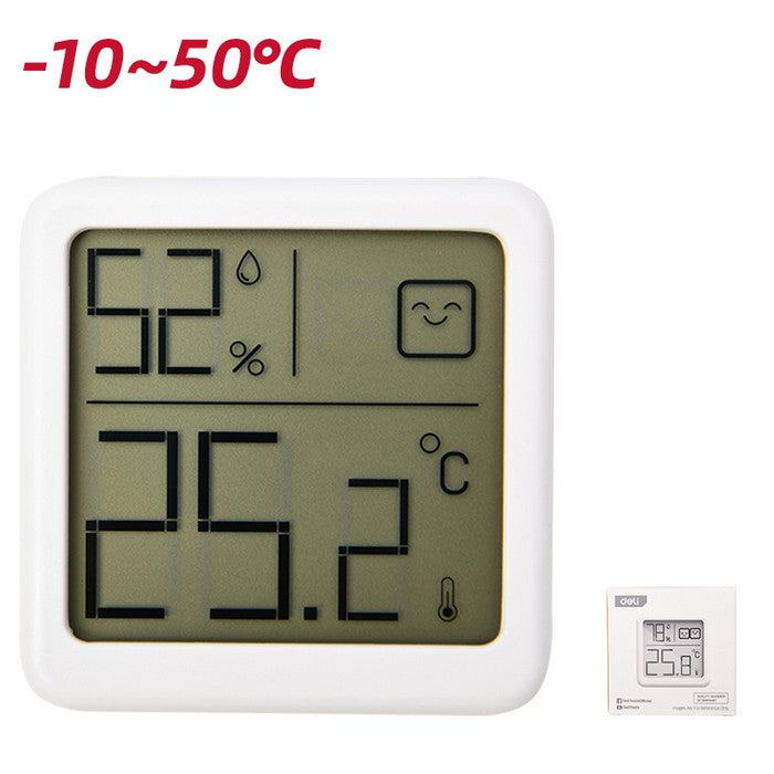 Termometru, Hidrometru digital Deli – afisare temperatura si umiditate, cu indicator de confort. Domeniu de masurare temperatura: -9,9°C până la 50°C. Domeniu de masurare umiditate: 10% RH pana la 99% RH. Baterie: CR2032. Dimensiuni: 45 x 45 x 9.5 mm.