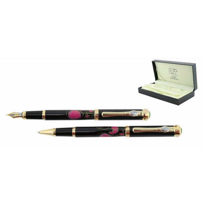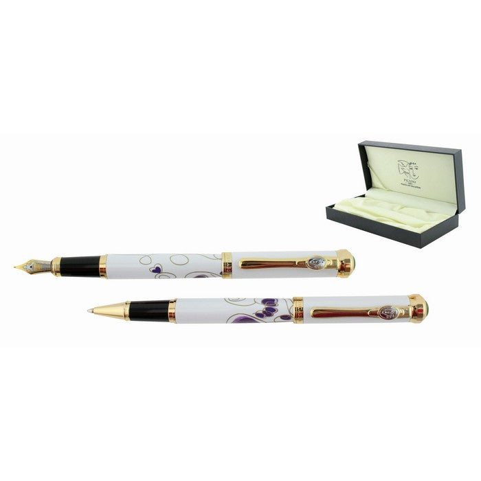 corp metalic cu accesorii metalice, stilou cu patron, penita iridium placata cu aur de 22K, pix cu mina tip Parker